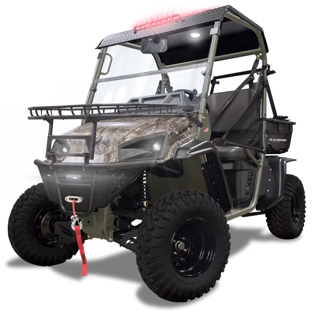 The Wilderness package adds outdoor-focused equipment such as forest green body styling, Realtree camo hood, LED hunting lights, armory rack, windshield, roof, and additional storage, giving it the capability required for hunting trips and off-grid exploration.